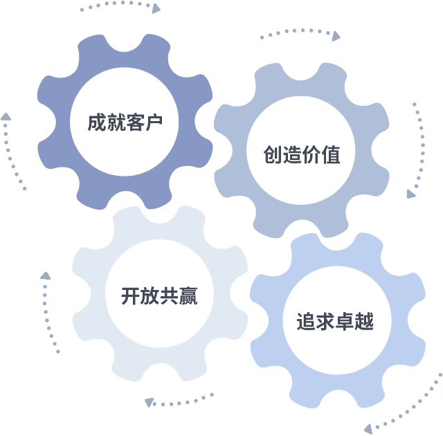 成就客户是一切决策的出发点,,,创造价值是衡量所有工作的标准,,,追求卓越是我们做事做人的态度,,,开放共赢是我们的格局也是最终的结果。。。价值观的齿轮环环相扣,,,,推动着组织里的每个人不断向前。。